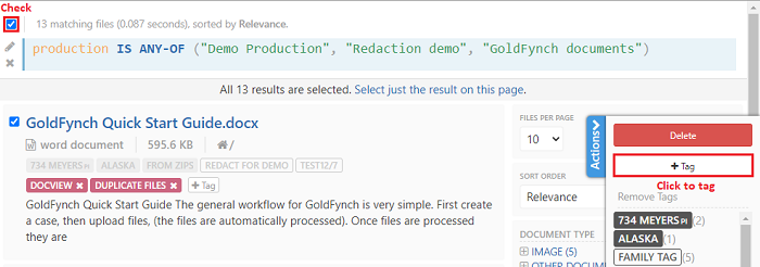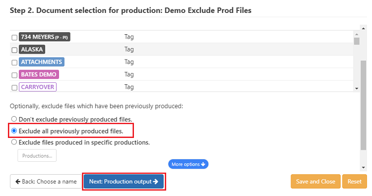 2a. Select the tags and saved searches that should be included in the production