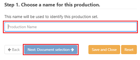Step 1. Enter a name for the production, then click on the 'Next: Document Selection' button