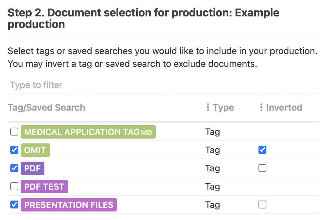 Step 9. Create your production following the regular steps of production, and in Step 2 (Document selection) while adding files to the production, in addition to selecting saved searches and/or tags to include files in your production, check the new tag you created ("OMIT" in our example) and check the 'Inverted' checkbox against it (learn more about inverting tags here.)
