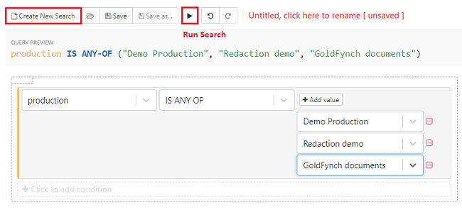 Step 6. Keep adding more values with the '+Add value' button and selecting productions till all productions in your case are selected (alternatively, you can choose to select only some production to omit files from only those productions)